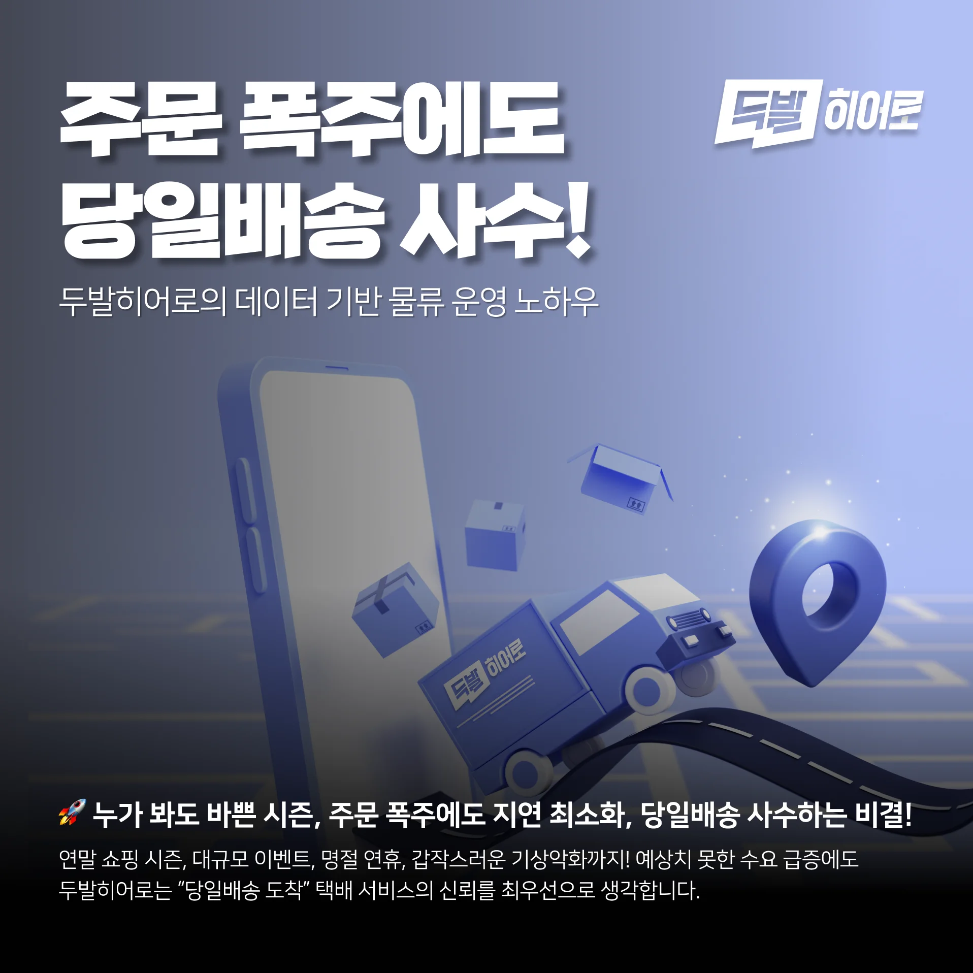 연말 쇼핑 시즌, 대규모 이벤트, 명절 연휴, 갑작스러운 기상악화까지! 예상치 못한 수요 급증에도 두발히어로는 “당일배송 도착” 택배 서비스의 신뢰를 최우선으로 생각합니다. 물론, 불가피한 외부 요인으로 부득이하게 배송이 다소 늦어질 수 있다는 점도 꼭 사전에 안내해드리고 있으니 참고 부탁드려요. 하지만 저희는 언제나 정해진 약속에 최선을 다하고 있습니다.