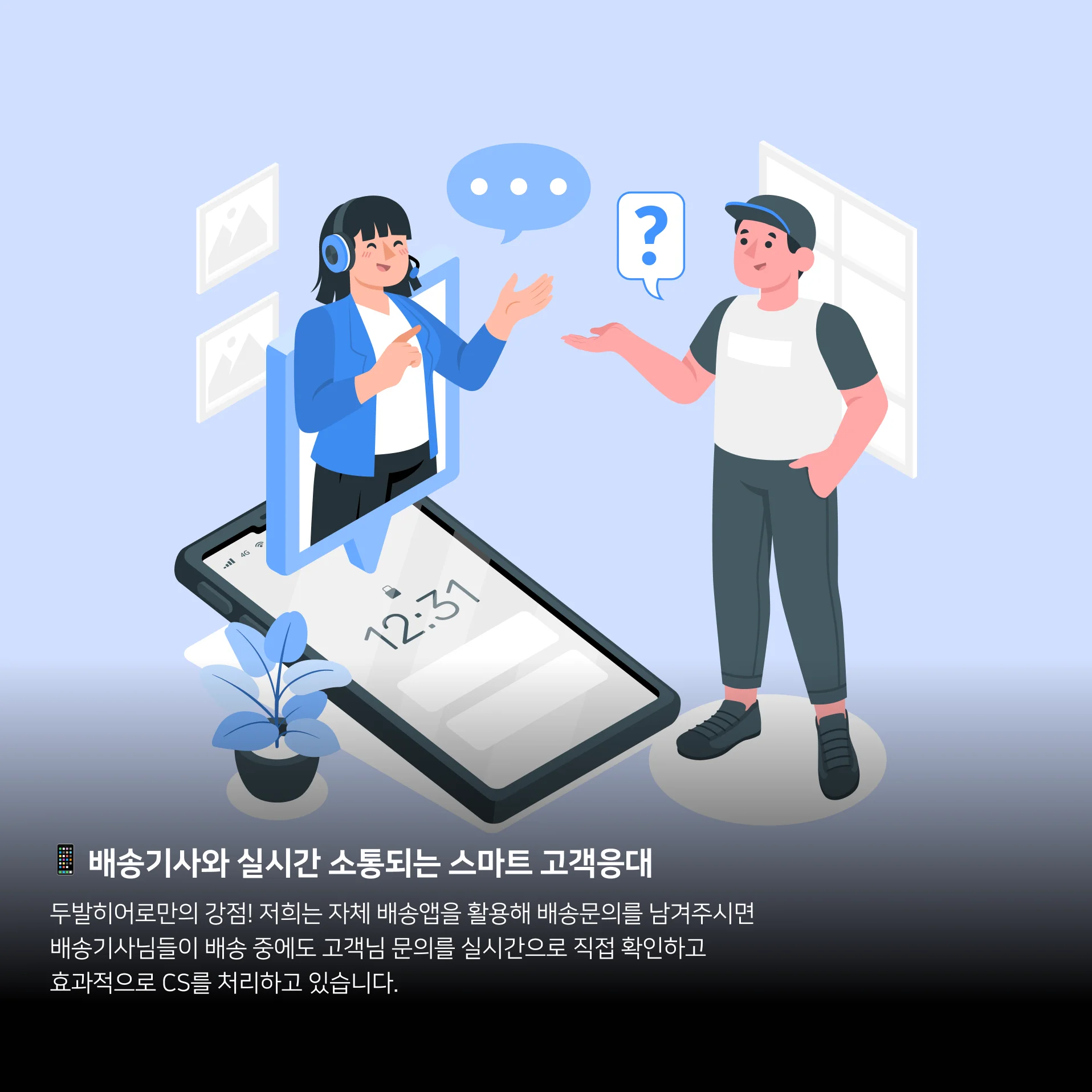 두발히어로만의 강점! 저희는 자체 배송앱을 활용해 배송문의를 남겨주시면 배송기사님들이 배송 중에도 고객님 문의를 실시간으로 직접 확인하고 효과적으로 CS를 처리하고 있습니다. 물건의 위치, 도착시간 문의, 현장 상황 전달까지 업무가 배송기사-관리자-고객 간 실시간으로 연동되기 때문에 더 빠르고 정확하게 상담과 안내가 가능해요.